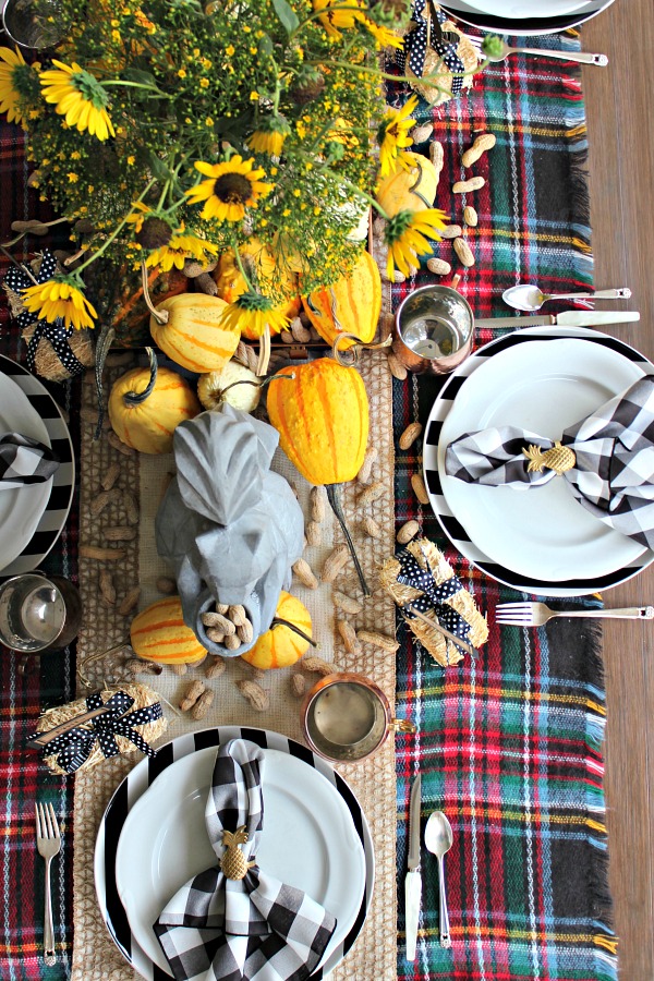 You might not expect to see flowers on an autumn table, but that doesn’t mean you can’t use them. This table uses the bright shades of yellow in the gourds and sunflowers to contrast with the dark flannel table runner.